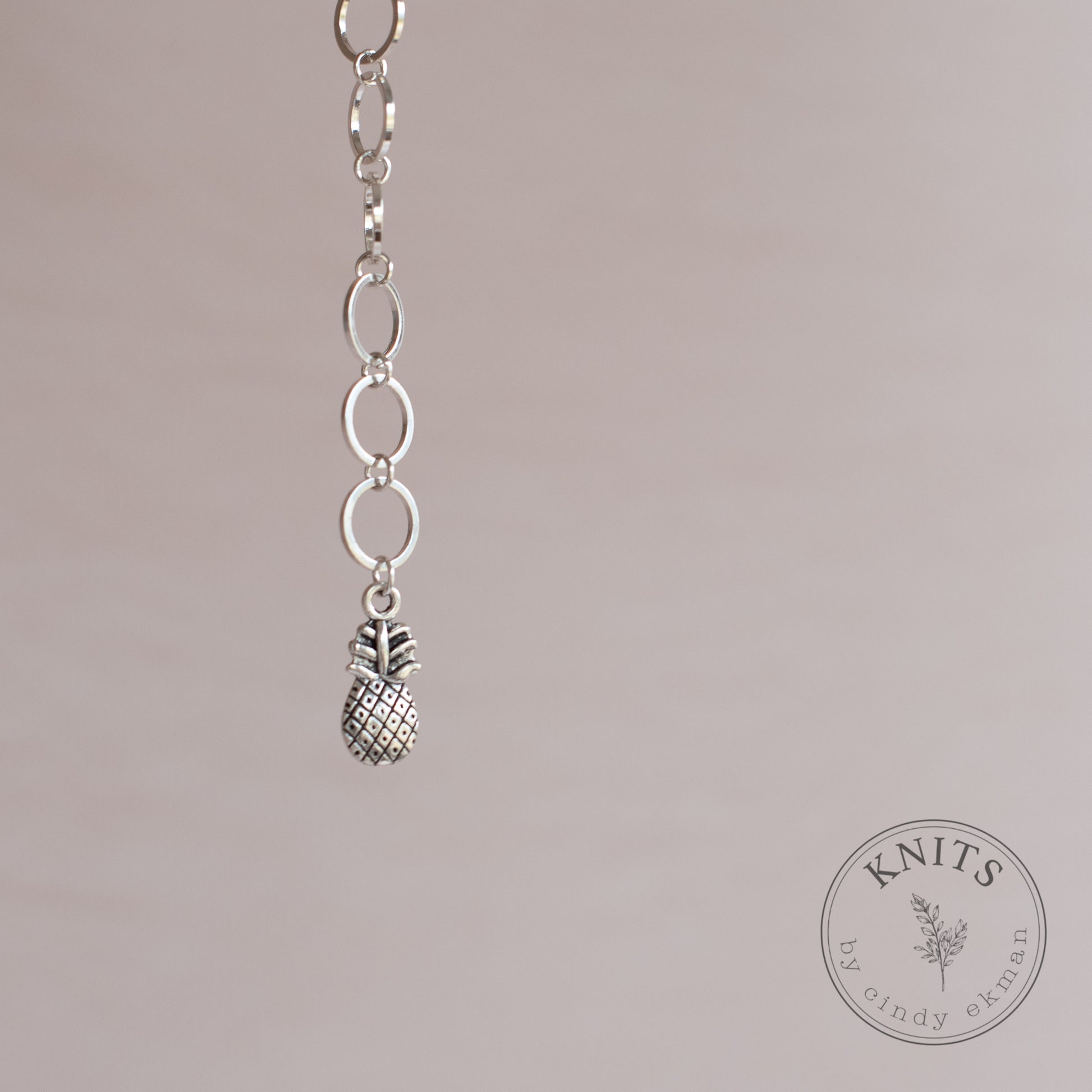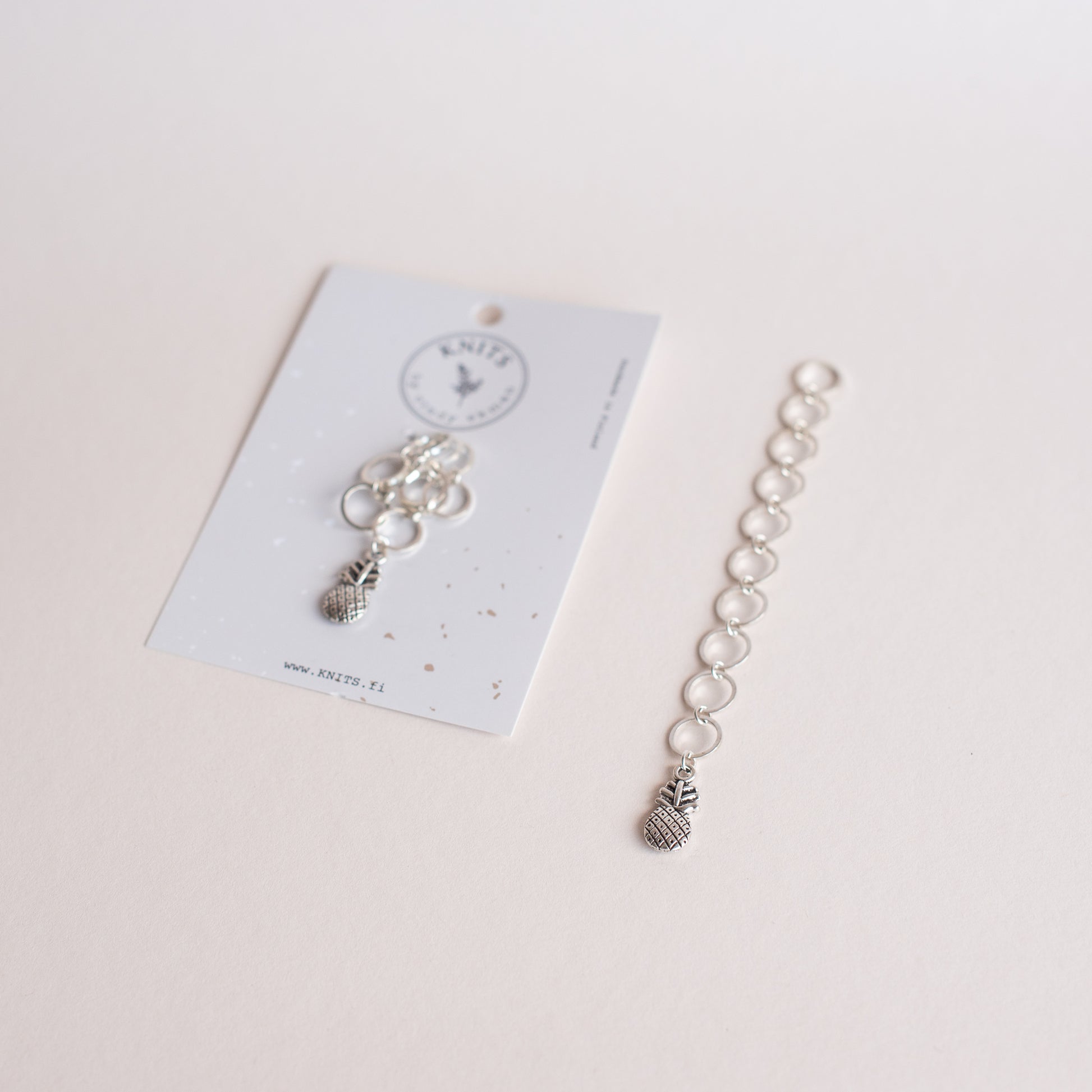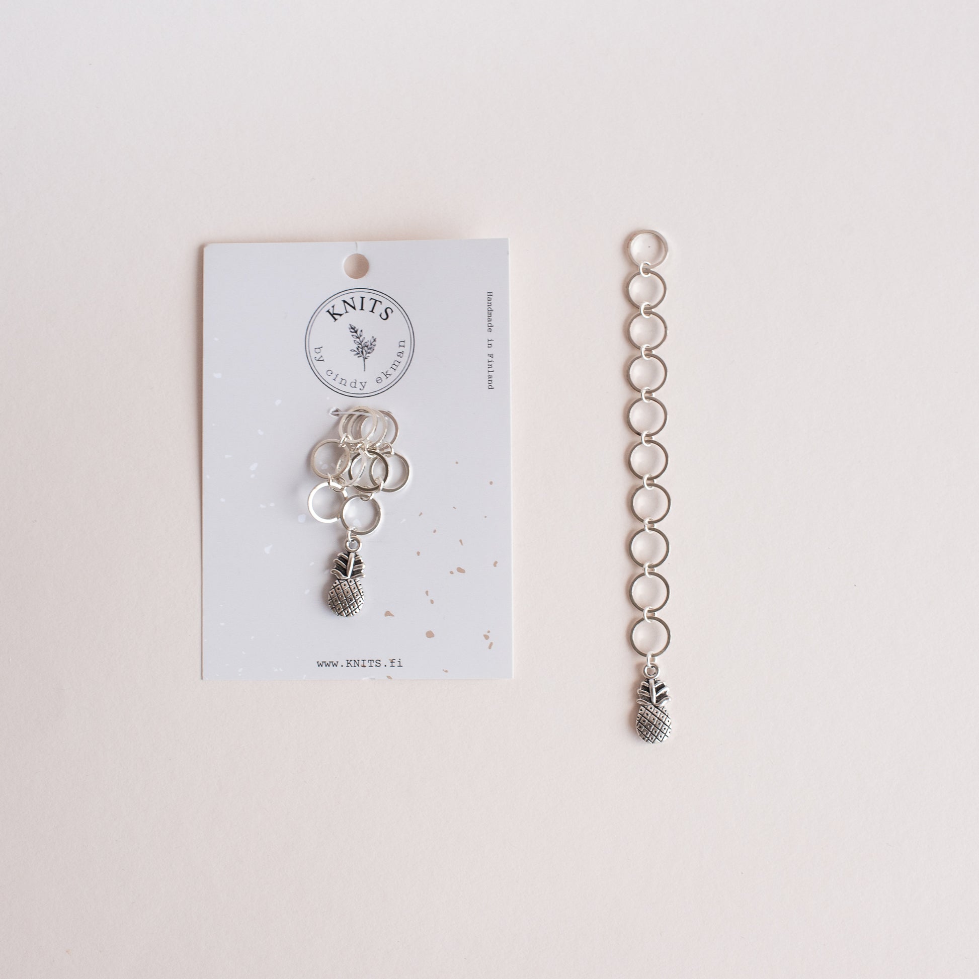 For each row you knit, move one ring towards the decoration to know where you are on your de/increases. Can be used with needle up to 7mm.