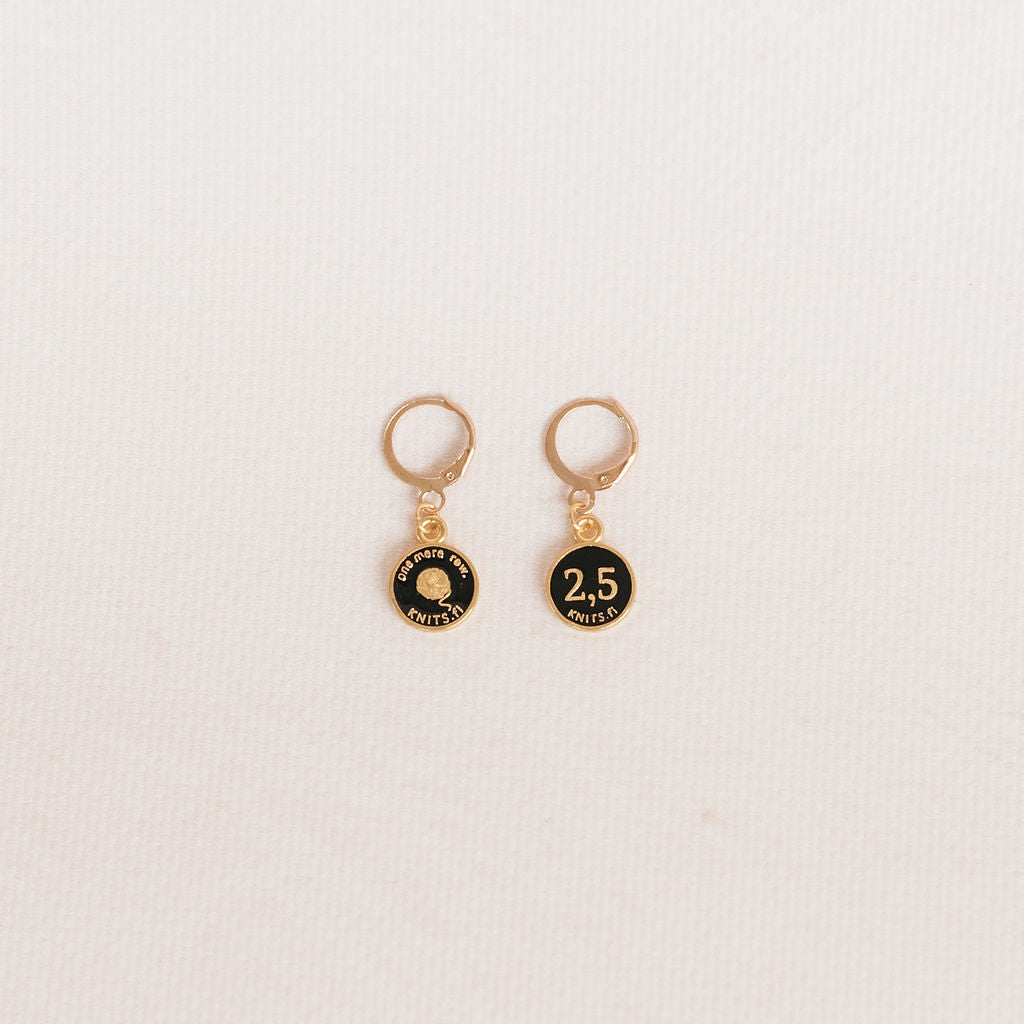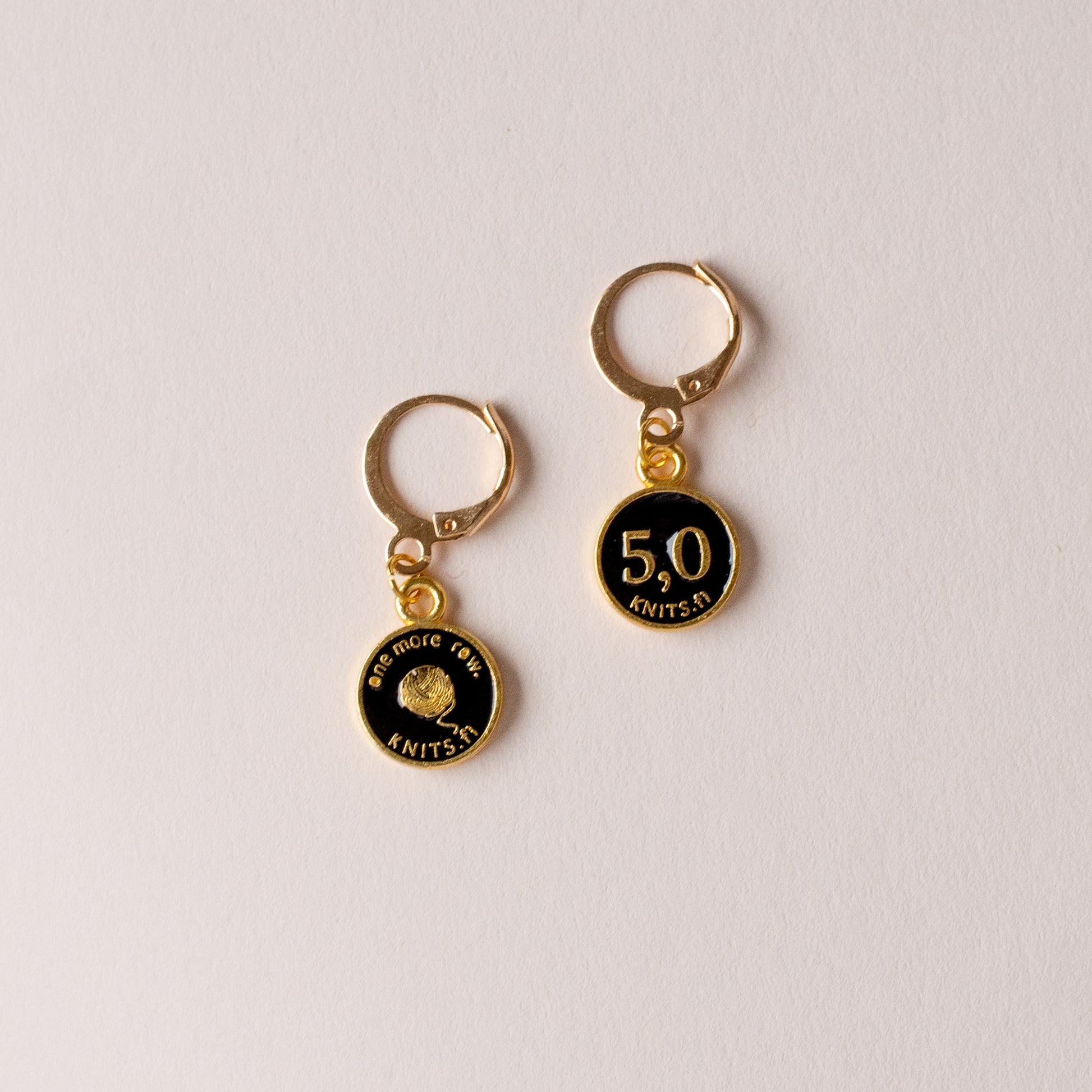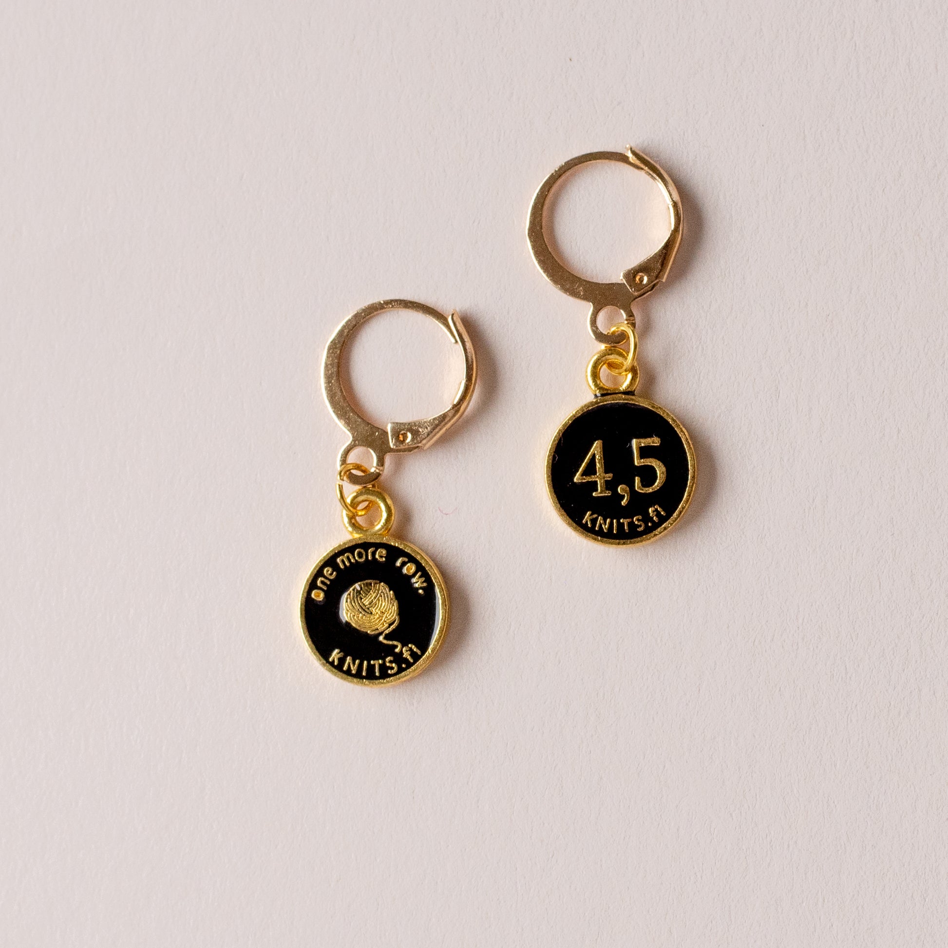 The decoration is two sided - size on front side and on the back side texts: "one more row" and "KNITS.fi".
