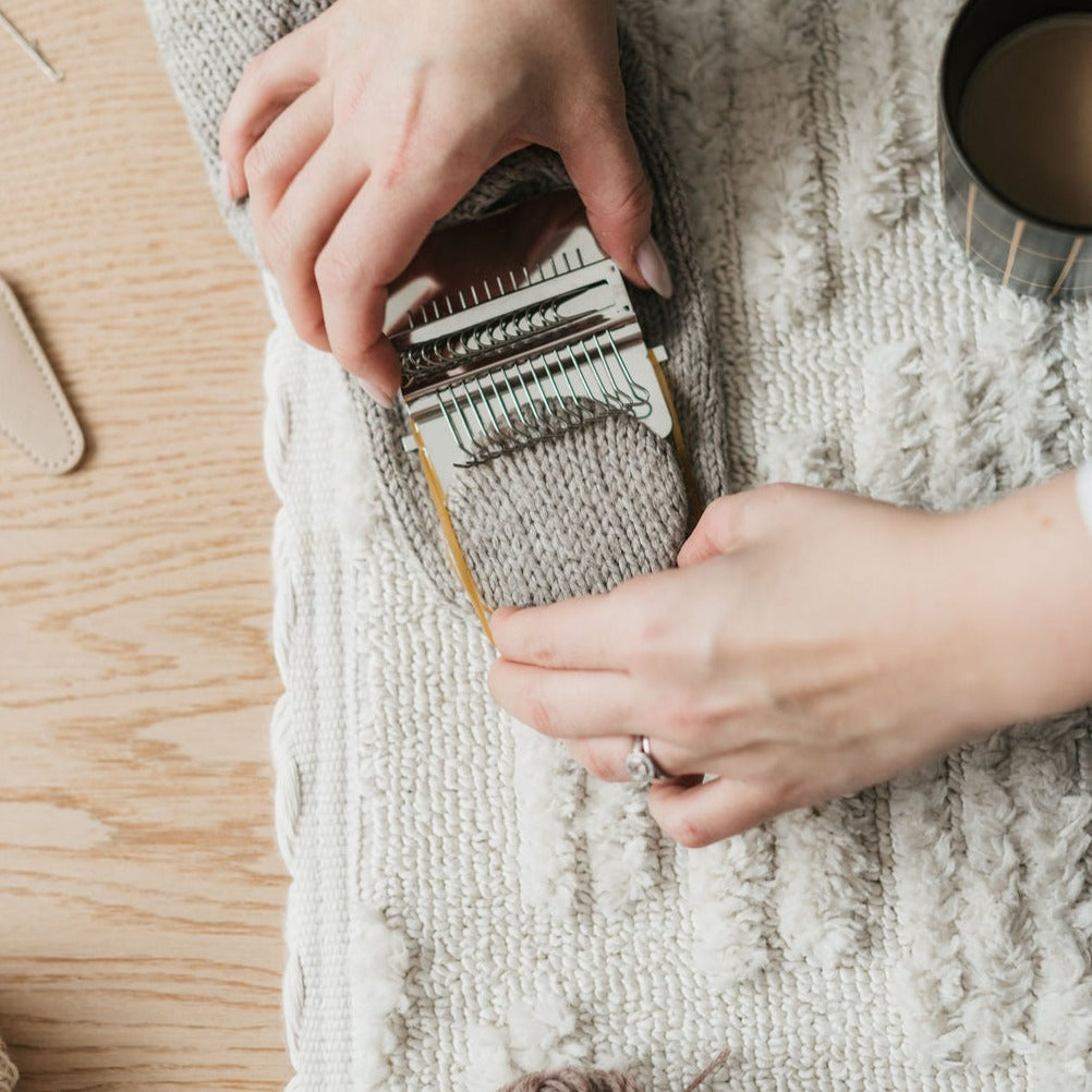 The mending tool works like a weaving frame that allows you to create small woven embellishments directly onto items not only knits but also on fabrics like textile bags, jeans, or shirts. It's easy to mend and rejuvenate clothes and knits. Be sure to read the instructions carefully and try using the frame on a test piece first to master the technique before starting more creative projects.